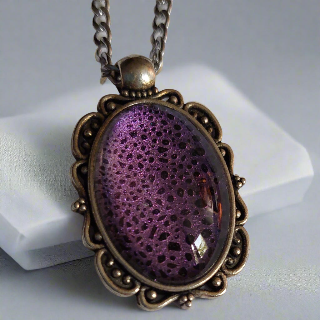 Pandantiv din rășină pe suport oval din aliaj inoxidabil – model inspirat de ”Purple Rain”