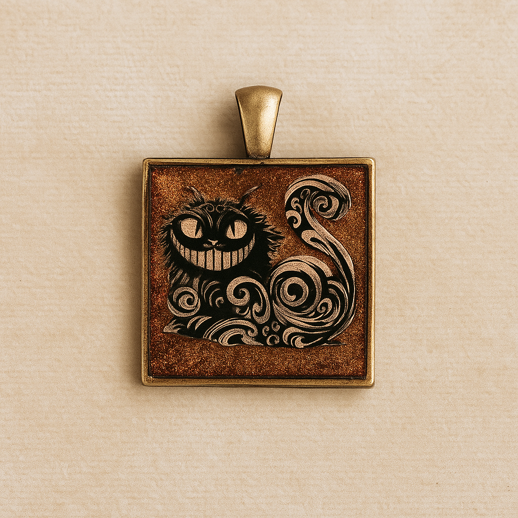 Pandantiv din rășină cu figurină din alamă încastrată, pe suport de bronz – inspirație Cheshire Cat din Alice în Țara Minunilor