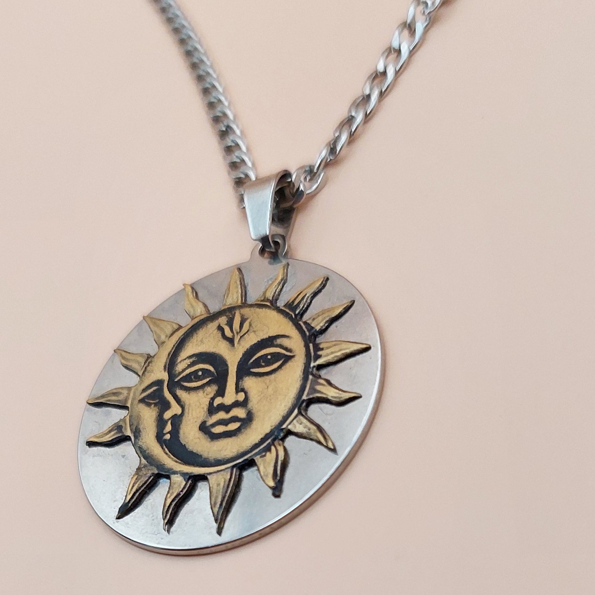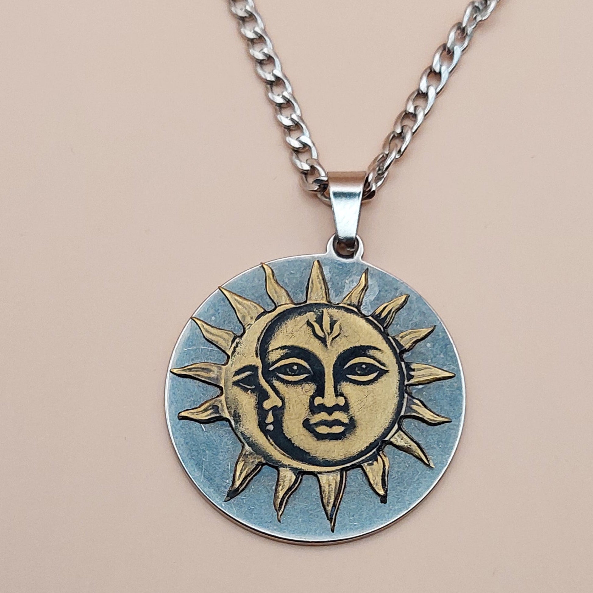 Acest pandantiv soare și lună îmbină eleganța alamei gravate cu un suport robust din oțel argintiu, oferindu-ți un accesoriu durabil și plin de simbolism. Designul său delicat aduce o notă rafinată oricărei ținute, în timp ce combinația de materiale asigură rezistență în timp. Perfect pentru cei care își doresc un simbol al echilibrului și armoniei aproape de inimă.